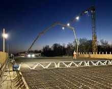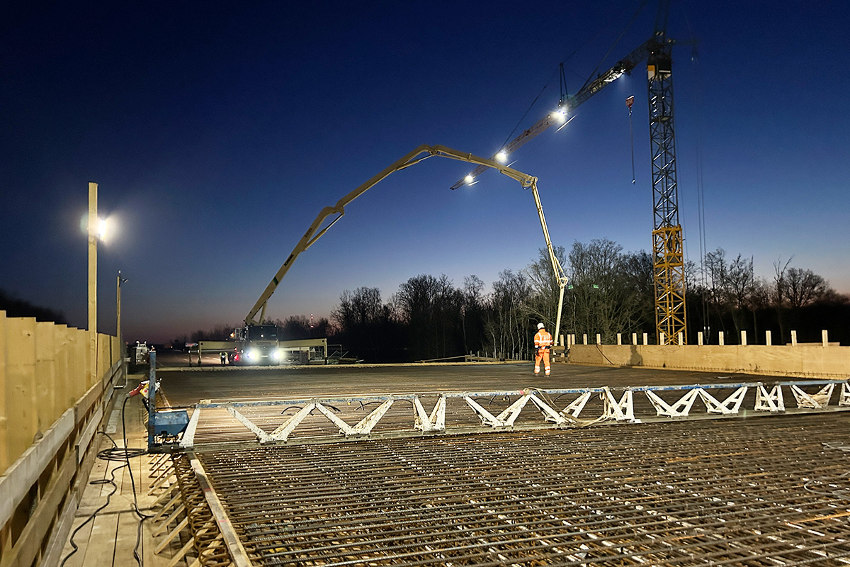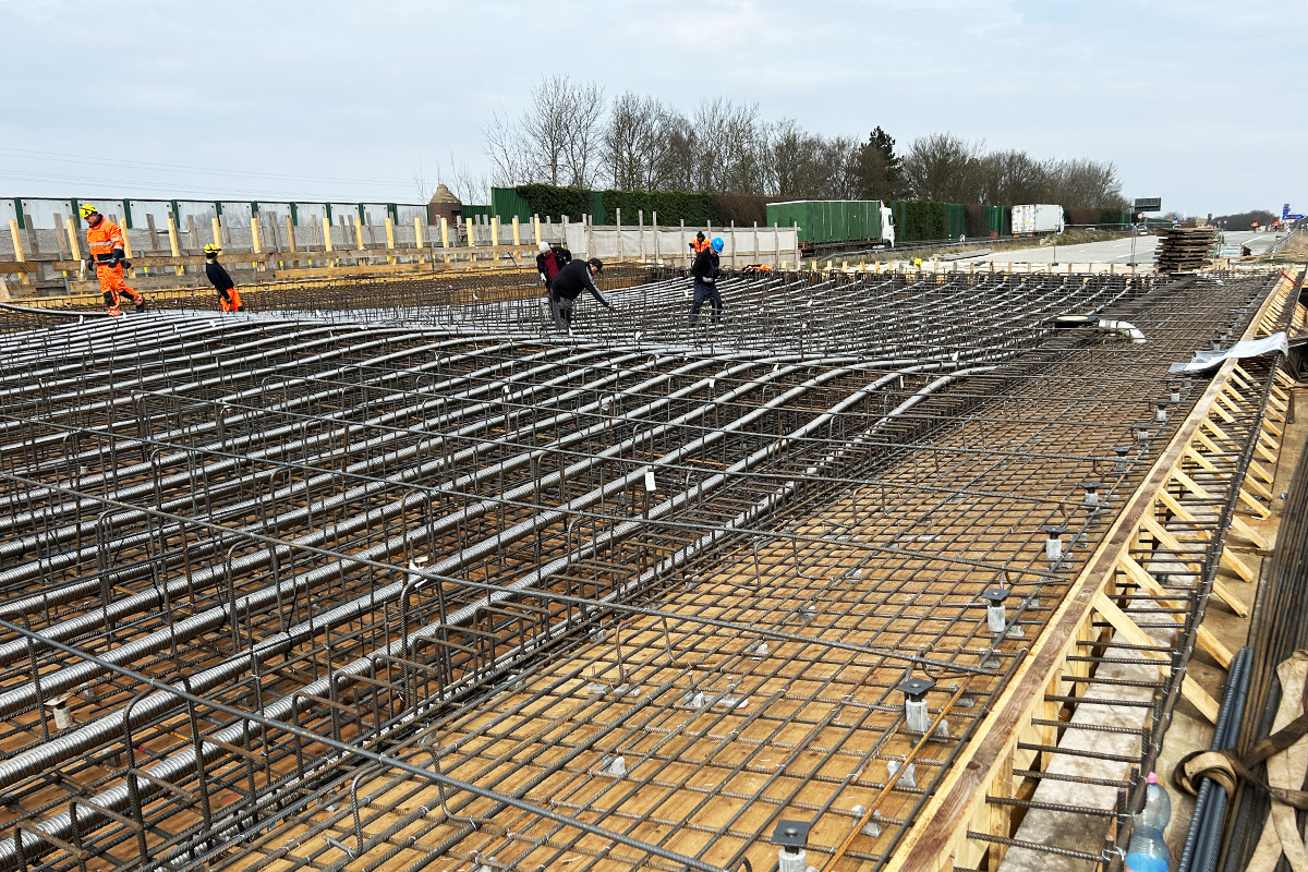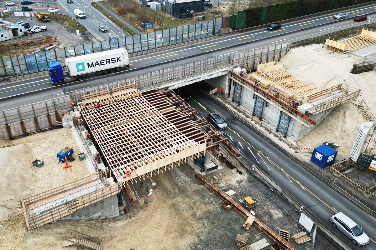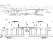 | Konstruktion | 2-Feld-Brücke, längsvorgespannte Straßenbrücke in 2 Bauabschnitten in Ortbetonbauweise |